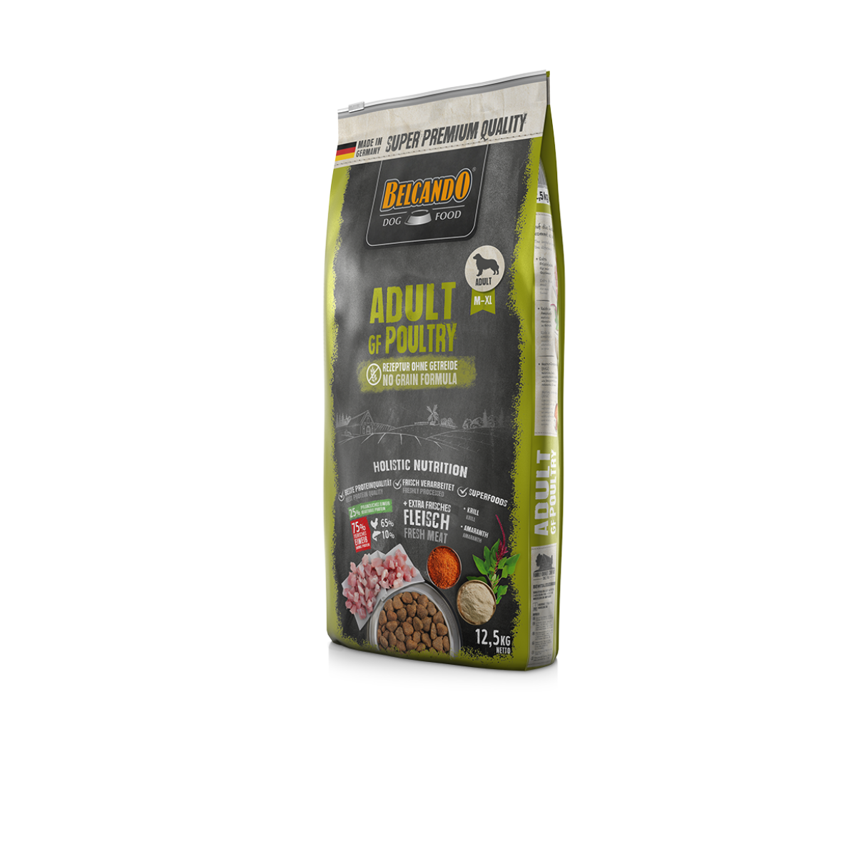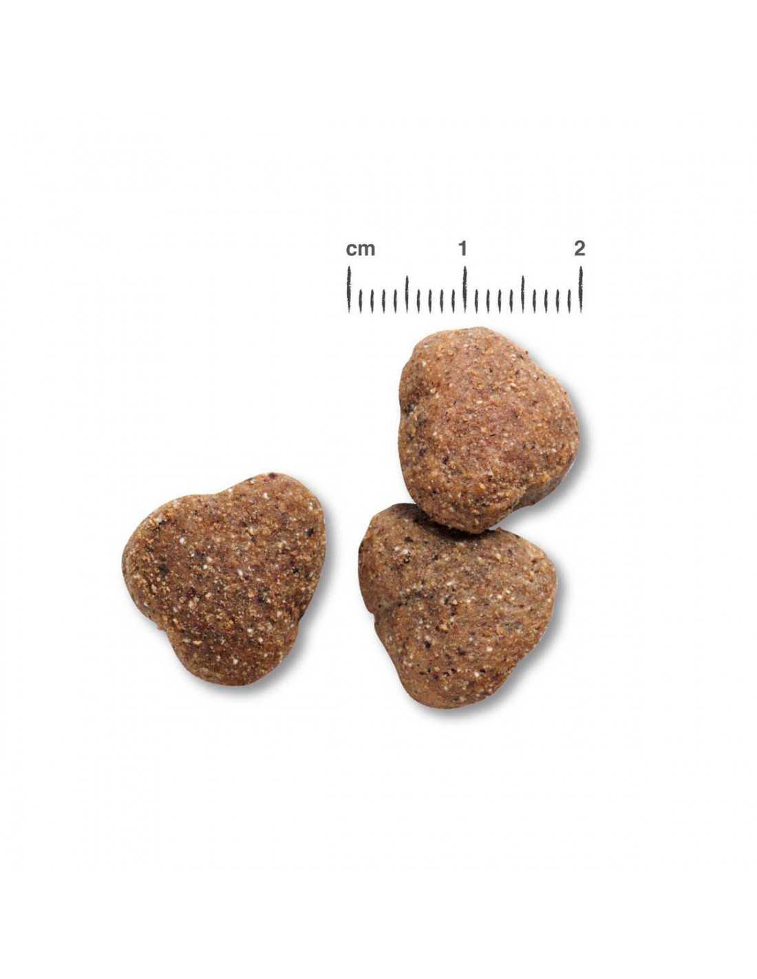 carne de ave fresca (40 %); amaranto (20 %); proteínas de ave deshidratadas con bajo contenido en cenizas (15 %); fécula de patata; harina de guisantes; zooplancton marino molido (krill, 2,5 %); semilla de uva prensada por expulsor; levadura de cerveza secada; vainas de algarroba, secas; grasa de ave; fosfato dicálcico; harina de pescado de agua salada (1 %); semillas de chía; hígado de ave hidrolizada; pulpa de remolacha seca, desazucarada; cloruro de sodio; cloruro de potasio; hierbas, secadas (total: 0,2 %; hojas de ortiga, raíz de genciana, centaura menor, manzanilla, hinojo, alcaravea, muérdago, aquilea, hojas de zarzamora); yucca schidigera