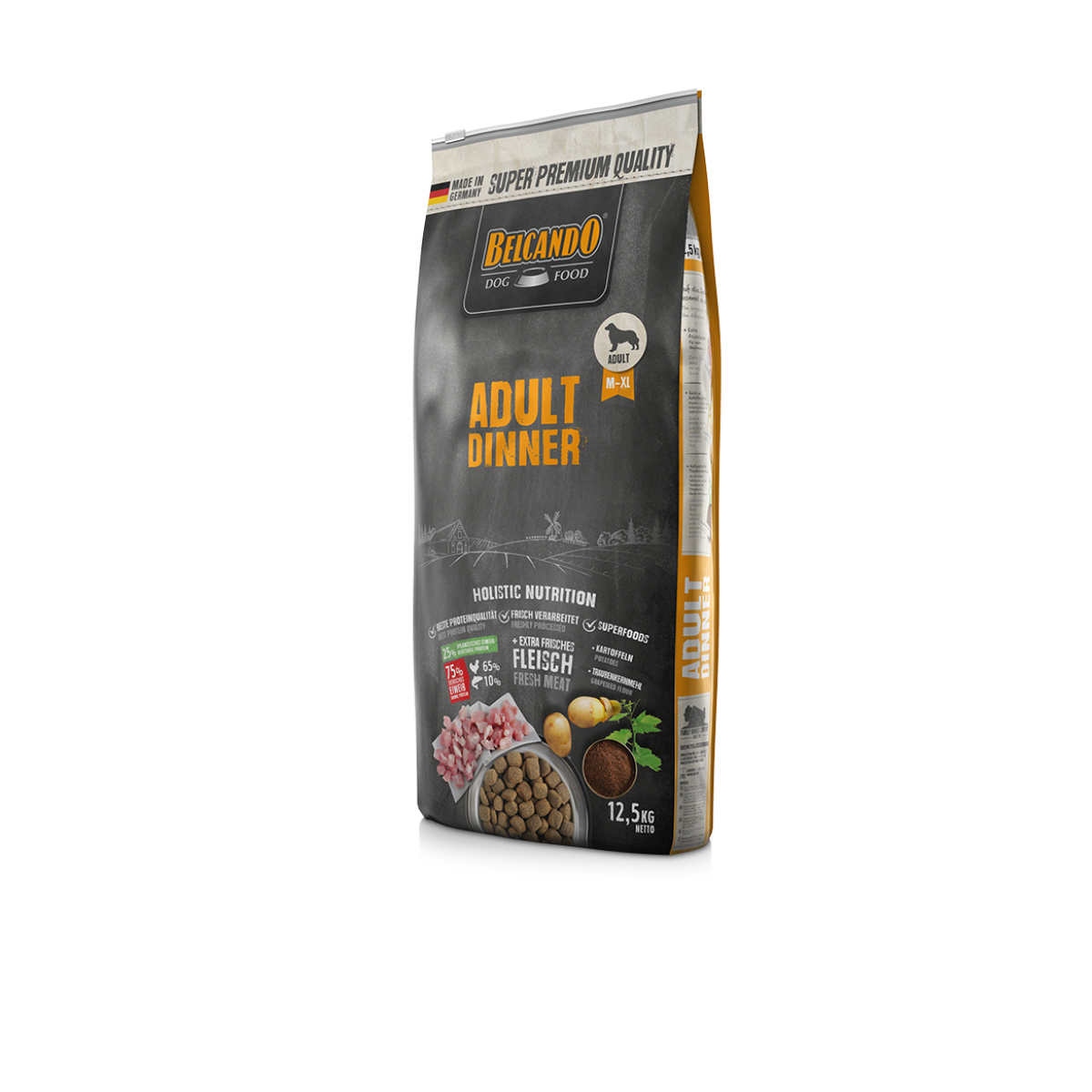 carne de ave fresca (30 %); maíz; proteínas de ave deshidratadas con bajo contenido en cenizas (16 %); arroz; fécula de patata (14 %); harina de pescado de agua salada (3 %); pulpa de remolacha seca, desazucarada; vainas de algarroba, secas; semilla de uva prensada por expulsor (2,5 %); levadura de cerveza secada; fosfato dicálcico; semillas de chía; hígado de ave hidrolizada; grasa de ave; aceite vegetal (palma, coco); cloruro de sodio; cloruro de potasio; hierbas, secadas (total: 0,2 %; hojas de ortiga, raíz de genciana, centaura menor, manzanilla, hinojo, alcaravea, muérdago, aquilea, hojas de zarzamora); yucca schidigera