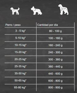Los valores promedio para la alimentación de un perro adulto con actividad normal se indican en la tabla.