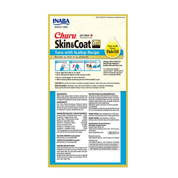 Snack cremoso elaborado a partir de ingredientes de grado humano con ácidos grasos omega-3 de aceite de pescado que ayudan a tu gato a mantener una piel saludable y un pelaje brillante. Libre de granos, colorantes y preservantes artificiales. Fortalecido con Vitamina E y té verde.