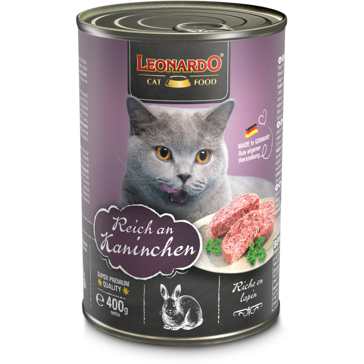 LEONARDO® Quality Selection Kaninchen es un alimento húmedo en lata indicado para gatos adultos rico en conejo. En su fórmula solamente se utilizan productos cárnicos frescos. Gracias a la alta disponibilidad biológica y a la alta calidad de estos productos, su gato necesita una cantidad relativamente pequeña para satisfacer sus necesidades nutricionales diarias.