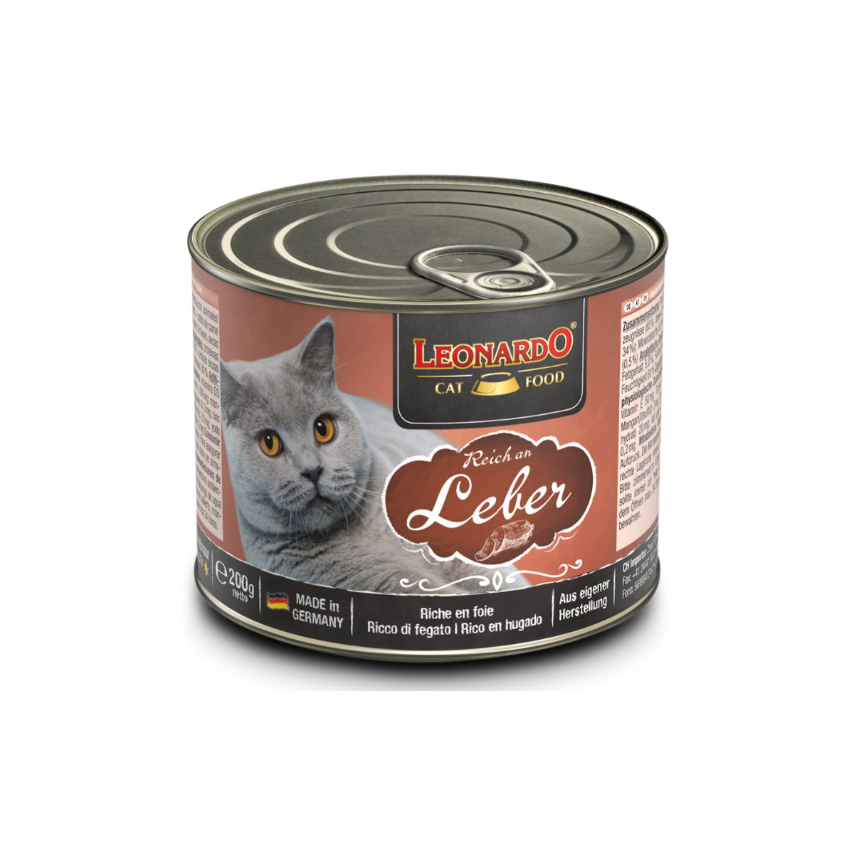 LEONARDO® Quality Selection Leber es un alimento húmedo en lata indicado para gatos adultos rico en hígado. En su fórmula solamente se utilizan productos cárnicos frescos. Gracias a la alta disponibilidad biológica y a la alta calidad de estos productos, su gato necesita una cantidad relativamente pequeña para satisfacer sus necesidades nutricionales diarias.