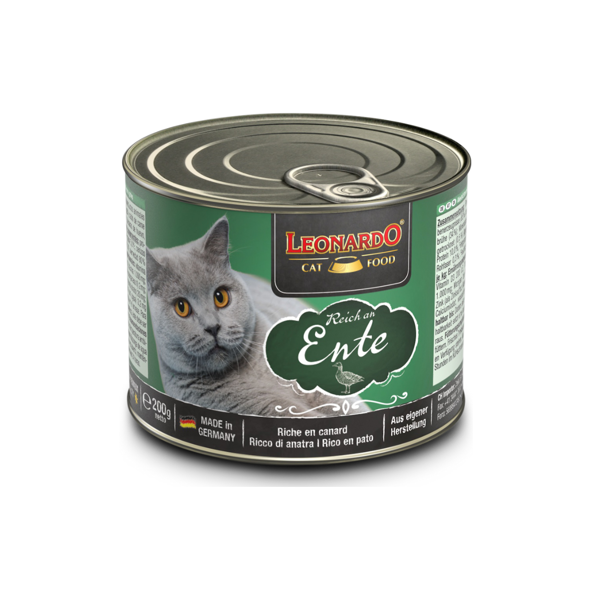 LEONARDO® Quality Selection Ente es un alimento húmedo indicado para gatos adultos rico en pato. En su fórmula solamente se utilizan productos cárnicos frescos.